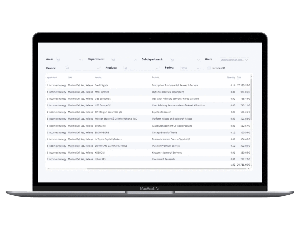 With Origin, it is possible to visualize the cost per user from received and paid invoices, and complement this information with data provided by users about how they use the service and the justification for such usage. This ensures that what is paid for is being used effectively and allows drawing conclusions both in terms of cost optimization and regulatory compliance.
